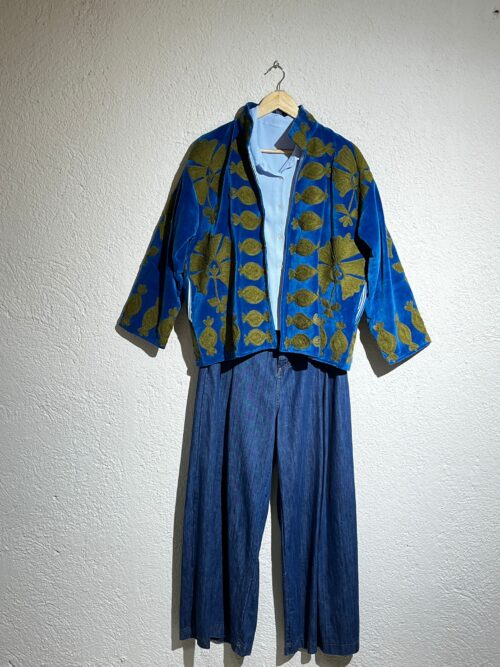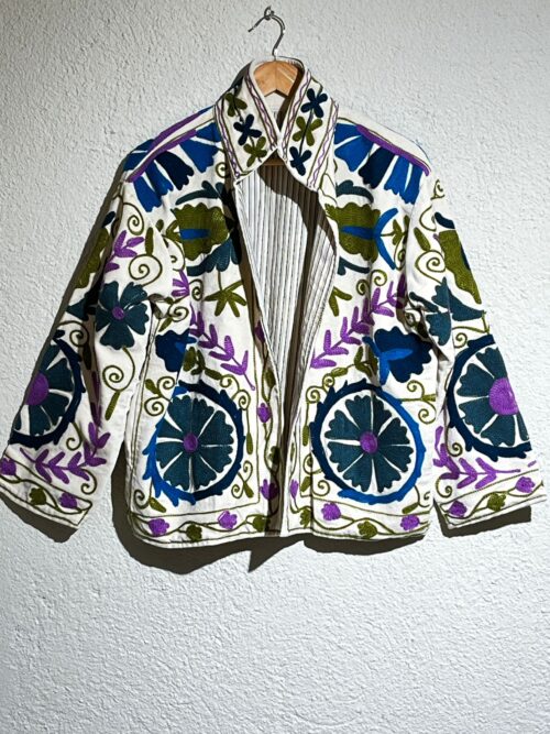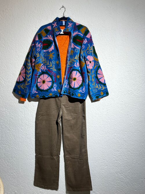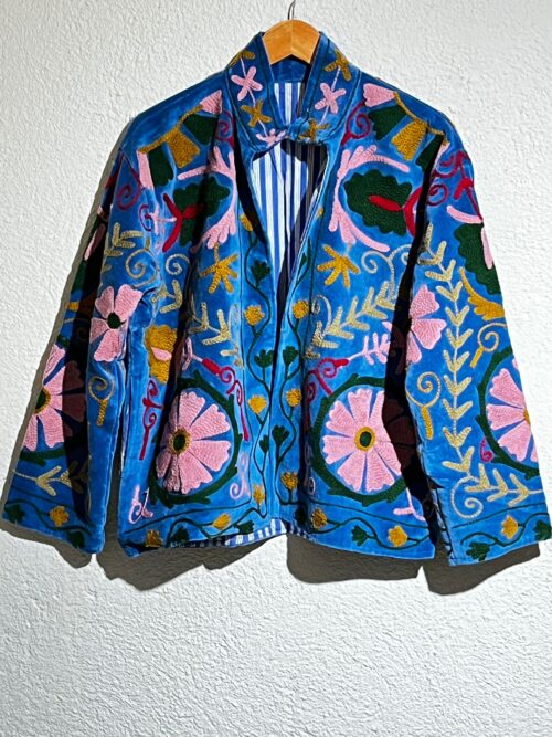 Chaqueta de terciopelo (?) verde decorada con bordados artesanales en azules vibrantes, rojos y tonos tierra. Su diseño floral de gran detalle aporta un estilo artístico y elegante.